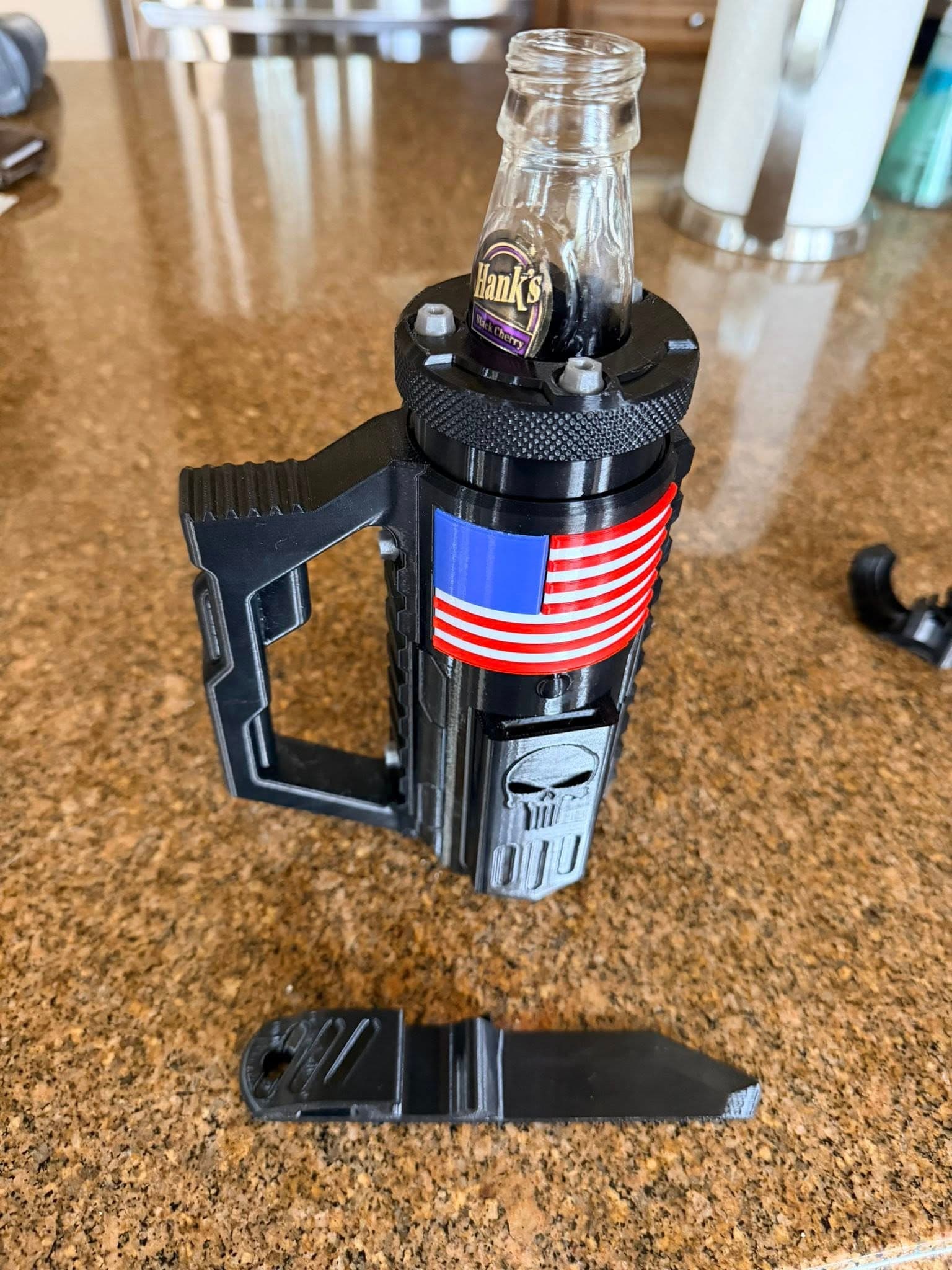 Custom can koozies — tactical and cotton-candy-cloud editions.